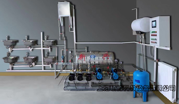 1、生活給水系統:主要有給水箱、給水泵、給水管道、壓力變送器、脈沖水表、水龍頭和淋浴頭等組成。管路采用不銹鋼管進行設計,可進行不銹鋼管的切割、安裝和通水試驗操作,通過控制系統可實現生活給水系統的變頻恒壓供水功能,實現單泵變頻控制或雙泵切換控制等功能;通過脈沖式水表可以完成用水量的計量。