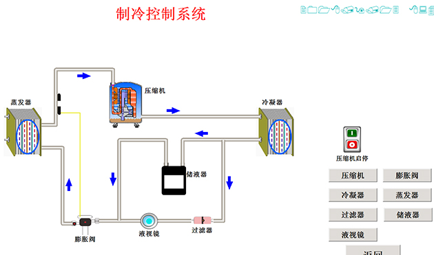 5、工作流程圖板3套:工作流程圖板詳細說明制冷系統流程、監測點溫度、系統壓力、工作狀態指示、系統部件說明。
