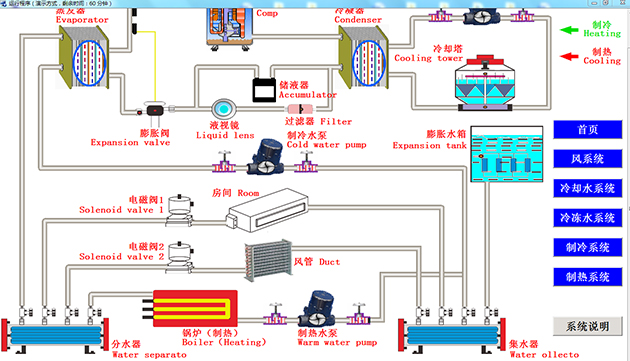 2)、是系統動畫演示:如壓縮機系統、制冷系統、制熱系統、風系統、集中送風系統、半集中送風系統的原理過程。