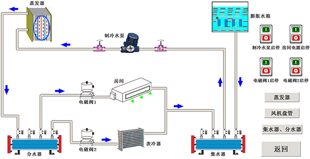 1)、系統主要部件說明組成:如壓縮機、卻水泵、冷卻風機、風機盤管、分水器、集水器、表冷器等。