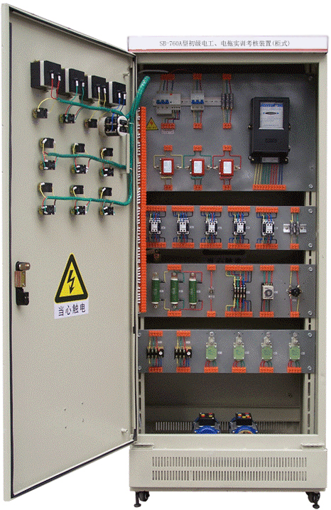 初級電工電拖實訓考核裝置,初級電工考核柜,初級電工實訓考核裝置是按照勞動社會保障部頒發的“工人技術等級標準”和“職業技能鑒定規范”的內容要求,根據初級電工培訓考核的實際情況而設計的新一代集培訓學習、理論驗證、實際操作能力、考核鑒定于一體的多功能柜式設備。整臺設備以標準的電氣控制柜為主柜,利用柜體的雙面空間,布置電器  及配套實驗器材,能完成初級電工考核鑒定中的電力拖動控制與照明電路的實操項目,該電工、電拖實訓考核裝置堅持理論聯系實際的原則,突出技能訓練,注重針對性、實用性、科學性,經全國多家職業技能訓練中心、職校、技校使用證明,該柜體設計合理、實操方便,占地面積少。為延長電器的使用壽命,各電器的接點都與接線端子相連,再讓學生在接線端子上接線,連接電機、電器來完成各項控制實驗,有效降低材料消耗,延長使用壽命。該套設備適用于各勞動職業技能鑒定部門,同時適應各大、中專、技校、職校初級電工、電拖專業教學與實訓考核。