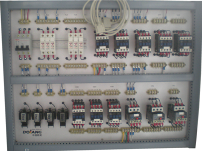 裝置實(shí)驗(yàn)柜正面為車(chē)床和銑床的機(jī)床電氣線路元器件布線區(qū)面板。背面是鉆床和磨床的機(jī)床電氣線路元器件布線區(qū)面板。面板上裝有低壓斷路器、直插式保險(xiǎn)絲、交流接觸器、熱繼電器、控制變壓器等元器件,這些元器件直接安裝在面板表面,可以很直觀的看它們的動(dòng)作情況,且都有相應(yīng)的測(cè)試點(diǎn),方便接線及故障考核檢測(cè)線路操作。