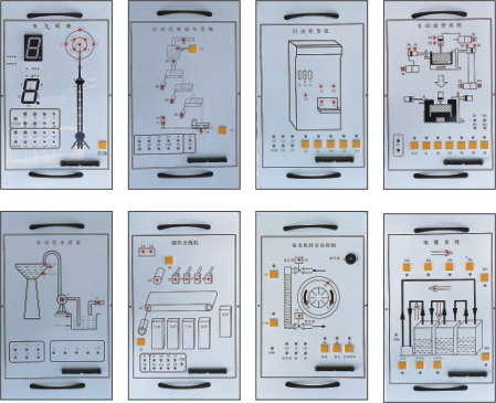 演示裝置上對PLC的輸入輸出均采用24V電源,5V電源供執行機構中的外圍使用,每套演示裝置主要由十七塊實驗掛箱組成,它們的型號分別為: