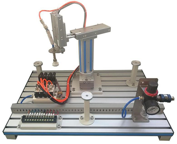 模型由回轉氣缸、雙軸氣缸、單軸氣缸、吸盤、真空發生器、電磁閥、節流閥、手滑閥、減壓閥、磁性開關、機械部件、工業鋁合金型材底板等組成,設有兩個抓取工位,可進行工件取放控制練習。可開展對氣動機械手的操作及編程控制訓練。配有空氣壓縮機:靜音無油,工作電源AC220V±10% 50Hz,輸入功率0.68kW;公稱容積24L,理論流量:116L/min,額定輸出氣壓0.7MPa。