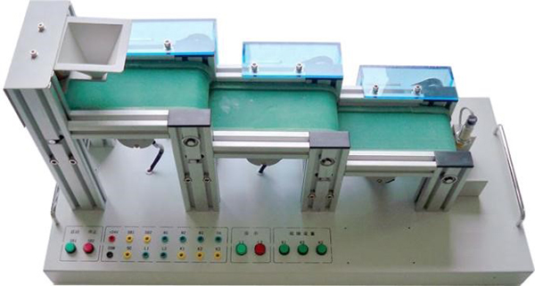 模型主要由漏斗上料裝置、三級傳送帶、直流電機、電磁鐵、電容傳感器、開關、指示燈、鋁型材框架、安裝底板、手柄等組成,通過PLC編程,可完成自動送料裝車系統的模擬控制。 |