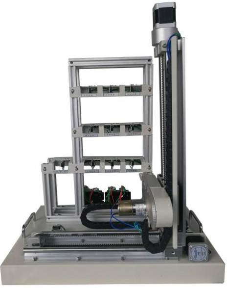 模型包含三層九倉位庫體、出/入庫倉位庫體、三維(X、Y、Z)運動機械及電氣控制等部分組成;定位執行機構由豎軸和橫軸組成;驅動機構由步進電機及步進電機驅動器組成;傳動軸為滾珠絲桿傳動和雙軸導軌帶傳動,傳動平穩。取物軸由直流減速電機驅動,可實現前后兩方向的運動。 |