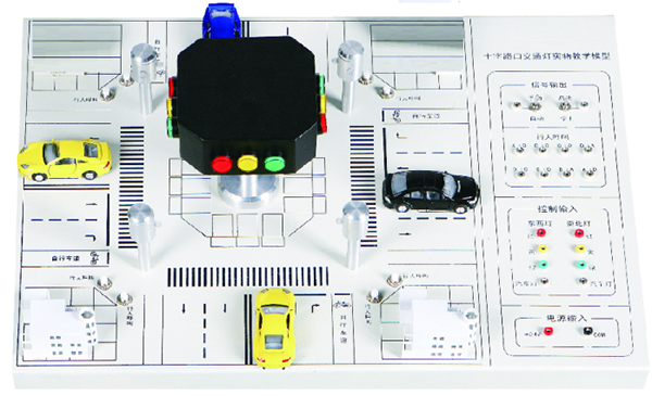 模型以實際十字路口按一定的比例微縮而成,配有道路模型、交通指揮燈、電氣控制接口區域等。具有指示和控制、啟/停按鈕、手/自動按鈕、行人呼叫按鈕、四方向紅/黃/綠燈指示等功能。