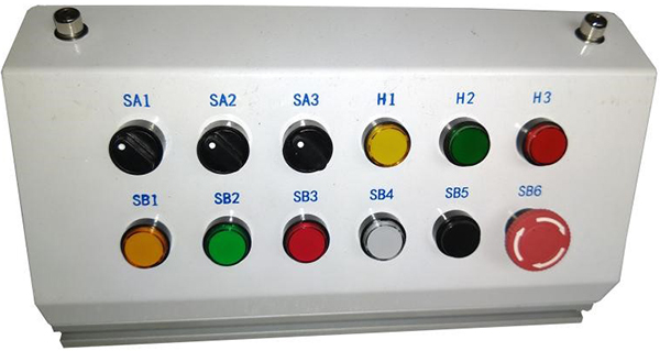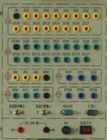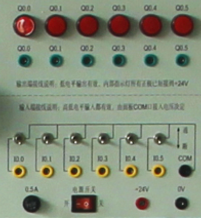 提供6路輸入、6路輸出等接口,輸入、輸出端電壓可自由切換0V和24V,輸出端由指示燈的亮滅來指示PLC輸出口的狀態,面板印有清晰的說明和端口絲印。通過基本指令練習,讓學生掌握PLC輸入、輸出的外圍接線和工作原理。