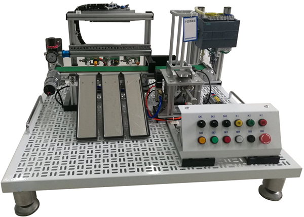 (4)按鈕模塊采用型材底座,安裝面板與桌面成45°夾角,包含急停按鈕1只,旋鈕開關3只,自鎖帶燈按鈕黃、綠、紅各1只,所有按鈕和旋鈕觸點均引至端子接線排上;自動上料模塊主體安裝在工業型材上,結構由鋁型材構成,方型工件庫1件,物料推出機構1件,光電傳感器,單缸氣缸1只,主要完成將工件庫中的工件依次推出;傳輸線模塊主要包含直流電機1臺,滾動軸承4只,滾輪2只,傳輸帶1條,主要完成將工件輸送到分揀區;物料檢測及分揀模塊主要包含氣缸3個,電感傳感器1只,電容傳感器1只;漫反射式光電傳感器1只,物料分揀槽3個,完成物料的分揀工作。調壓閥主要安裝在型材底座支架上,含有手滑閥可控制氣路的通斷和壓力。輔助器件包含接線端子、物料、實訓導線、氣管等,模型控制所需的I/O點數與所配主機I/O點數相配套。氣缸使用范圍0.1-1MPa,工作溫度-15-60℃,活塞帶磁環可完成檢測;光電傳感器檢測范圍不小于1CM,輸出電流80-200MA,防護等級IP65,輸出方式NPN常開;傳感器檢測范圍不小于1CM,輸出電流80-200MA,防護等級IP65,輸出方式NPN常開。