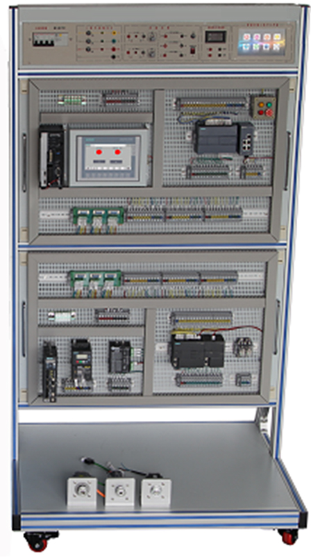 采用立式網孔板結構,由工業鋁型材搭建而成,上方為電源控制模塊,下方為網孔式安裝板。底部設有帶剎車萬向輪,方便移動布局。臺架尺寸約為1000×800×1800mm。 頂端電源模塊,提供實訓所需的三相交流380V、單相220V電源接口,具有啟動、停止、急停系統,設有漏電保護、電源指示、過流保護等功能。設有DC24V控制電源,配有控制開關及輸出接口,帶短路保護功能。 |