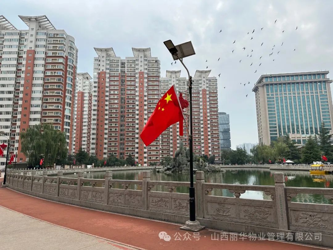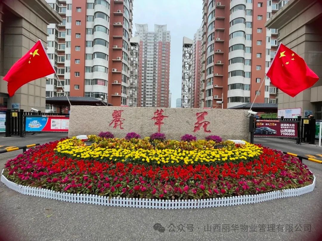 國旗飄揚(yáng),花團(tuán)錦簇。麗華物業(yè)在管區(qū)充分利用戶外LED電子屏、燈桿、宣傳欄、小區(qū)出入口等醒目位置,懸掛國旗、擺放花卉盆栽、播放愛國視頻短片,營造節(jié)日喜慶氛圍,增添濃厚的愛國熱情。