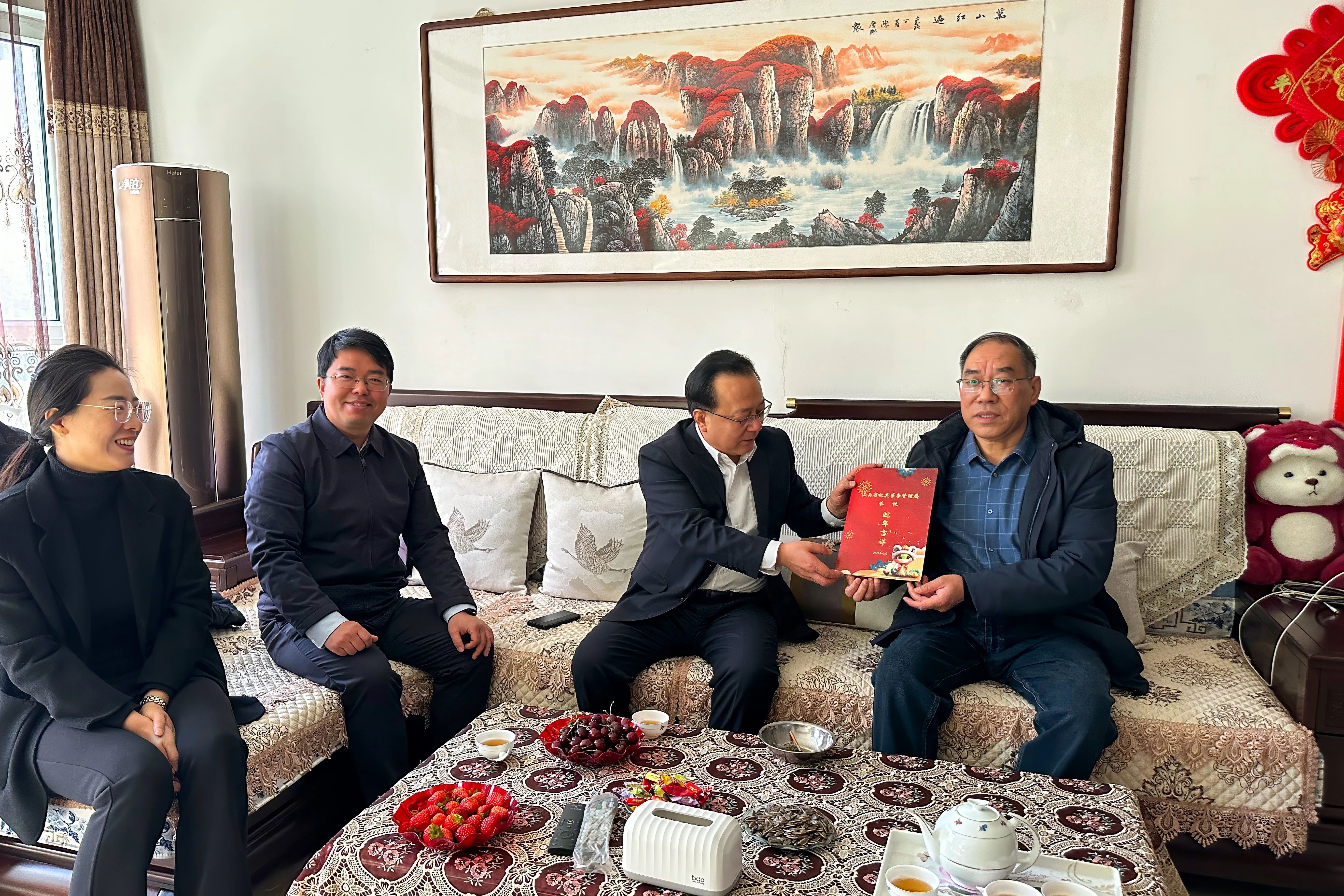 高晉紅每到一戶,都與老同志親切交談,深入了解家庭生活情況,關(guān)切詢問日常起居、身體健康狀況,感謝他們對全局改革發(fā)展的關(guān)系和支持,鼓勵(lì)他們保持積極心態(tài),參與各類活動,祝愿他們過一個(gè)溫馨祥和的新年。要求相關(guān)處室單位繼續(xù)用心用情用力做好服務(wù)保障工作,落實(shí)落細(xì)老干部福利待遇,真正把組織的關(guān)懷溫暖送到大家心坎上。