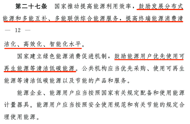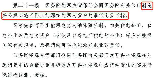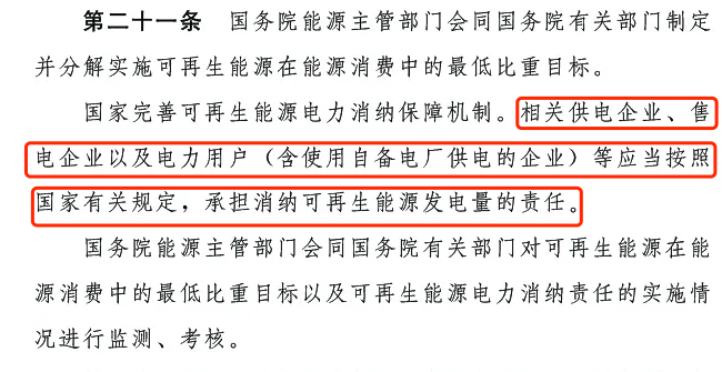第二十一條:國家完善可再生能源電力消納保障機制。相關(guān)供電企業(yè)、售電企業(yè)以及電力用戶 (含使用自備電廠供電的企業(yè))等應(yīng)當(dāng)按照國家有關(guān)規(guī)定,承擔(dān)消納可再生能源發(fā)電量的責(zé)任。國務(wù)院能源主管部門會同國務(wù)院有關(guān)部門對可再生能源在能源消費中的最低比重目標(biāo)以及可再生能源電力消納責(zé)任的實施情況進行監(jiān)測、考核。