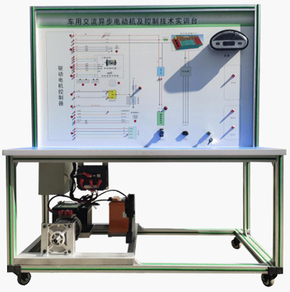 檢測控制面板(裝有各種檢測端子,1448×940mm彩色電路圖和工作原理示意圖)、組合儀表、點火開關、電機控制器、車載充電器與充電接口、DC-DC轉(zhuǎn)換器、鋰動力電池組、電動車電機(交流異步電動機)、剎車開關、檔位開關、油門控制裝置、大電流繼電器、電源總開關、急停開關、輔助蓄電池(12V45AH)、一體化全鋁合金型材搭建的移動臺架(1500×700×1700mm (帶自鎖腳輪裝置,帶安裝檢測端子的原理面板,面板1448×940mm)、設備操作說明書。
