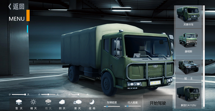 7.1、仿真車模型:10 種典型虛擬車輛模型:東風(fēng)猛士、北汽勇士、 EQ1118、EQ1121、 EQ2102、SX2150、SX2190、豪濼 ZZ2197、東風(fēng)天錦、大客車等,并可根據(jù)需要拓展、定制個(gè) 性化車輛模型。