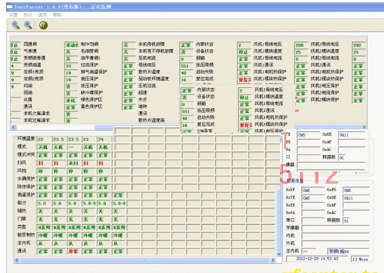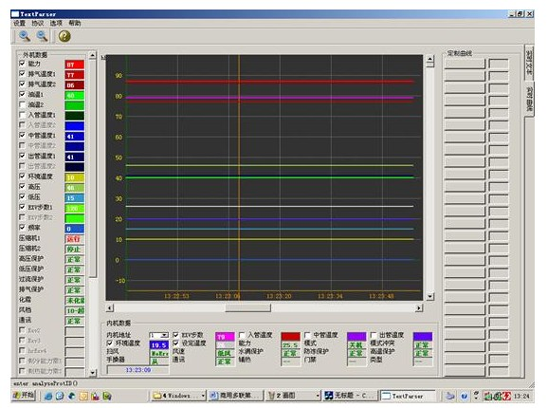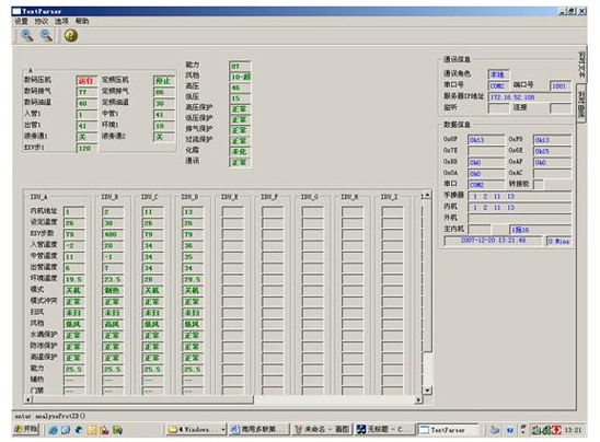 中央空調(diào)機(jī)由于工程復(fù)雜,設(shè)備分散,有的已經(jīng)裝修在開花板上測試程序,一但出現(xiàn)了故障,工程量相當(dāng)大,為了能夠快速準(zhǔn)確地測出故障是由主機(jī)機(jī)組還是室內(nèi)機(jī)的故障的,每個(gè)生產(chǎn)廠家根據(jù)生產(chǎn)的和維修的需要而開發(fā)了中央空調(diào)測試程序。可測試壓縮機(jī)的運(yùn)轉(zhuǎn)頻率,傳感器的各種數(shù)據(jù),電子膨脹閥的工作步數(shù)等幾十種中央空調(diào)的工作數(shù)據(jù)和狀態(tài),軟件可實(shí)現(xiàn)對內(nèi)機(jī)的控制,,可以對1-64臺(tái)內(nèi)機(jī)的狀態(tài)進(jìn)行設(shè)定。是高校提供了好的研究的學(xué)習(xí)設(shè)備。
