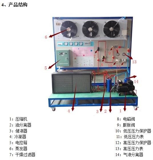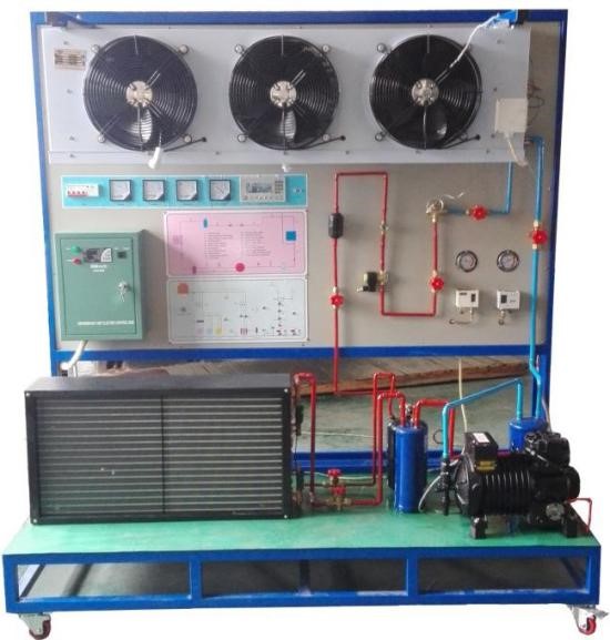 工業制冷系統實訓考核裝置主要由半封閉式制冷壓縮機、冷凝器、蒸發器、膨脹閥和故障設置開關、測試儀表等組成。實訓臺通過手閥開關和鈕子開關分別來設置管路系統和電控系統的 20 多種故障。設備采用先進的電控系統并具有具有開相,缺相, 過流等保護功能。蒸發器風扇采用變頻器控制速度。配備 8 路溫度計,電壓表,電流表,功率表,功率因數表和壓力表,能實時觀察運行參數