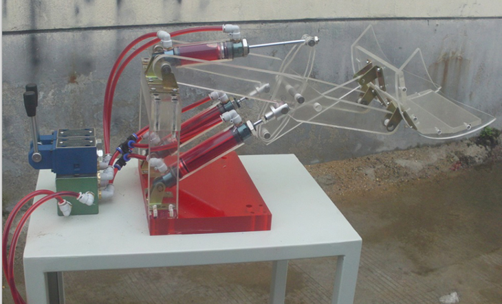 透明裝載機實訓臺主要由底柜,透明大臂,透明動臂,透明裝斗,透明油缸,透明集成閥島,透明手動換向閥,支架組成