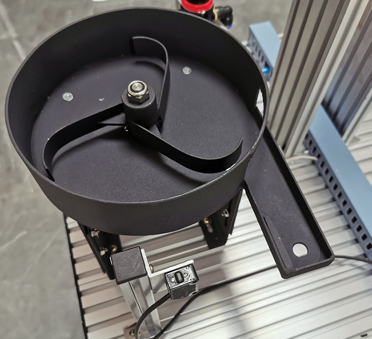 放料轉盤:轉盤中共放三種物料,一種金屬物料、一種黑色塑料物料、一種白色塑料物料。