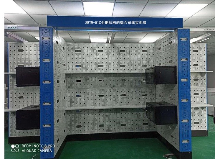 1)裝置采用全鋼結構,模擬一棟建筑樓宇內部真實環境,除可進行綜合布線工程技能實訓外,也適合于智能樓宇安防監控實訓使用。采用2.0mm優質冷軋鋼板,內置各種網絡設備、插座、線槽、機柜等安裝孔,保證20000次無塵重復操作;仿真墻內部采用高強度龍骨支架支撐,所有鋼板通過高強度鉚釘固定在龍骨支架上,墻面平整無任何凹槽,模塊化組合安裝,裝置可全封閉,也可根據教學需求,實訓裝置背部全開放,學生可以直觀看到墻體的內部,可在墻體內部根據教學需要,進行各種路由暗管安裝。可視面積為≥6.24平方米。安全可靠,無塵化操作。如:8模塊裝置可同時或者交叉模擬網絡綜合布線工程的8個工作區、8個設備間、8個垂直、8個水平、8個管理等子系統實訓。模塊化設計,能按教室尺寸合理布局,適合任意樓層安裝。