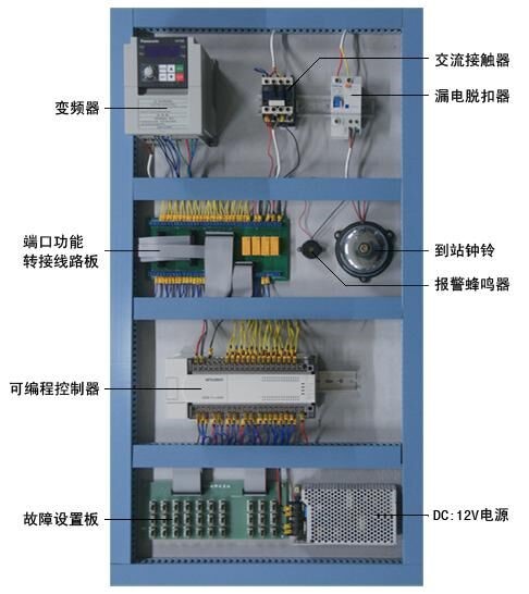 電梯的電氣控制系統(tǒng)采用PLC和交流變頻調(diào)速控制,其硬件結(jié)構(gòu)的組成及功能與實際電梯完全一樣。具有自動平層、自動關(guān)門、順向響應(yīng)轎內(nèi)外呼梯信號、直駛、電梯安全運行保護以及電梯急停、慢上、慢下、照明、風扇等功能,性能可靠、運行平穩(wěn)、操作簡單、能耗低,特別適合于教學。此外,透明仿真教學電梯的軟硬件均采用開放式結(jié)構(gòu),因此,院校也可以利用此套裝置進行二次開發(fā)研究。