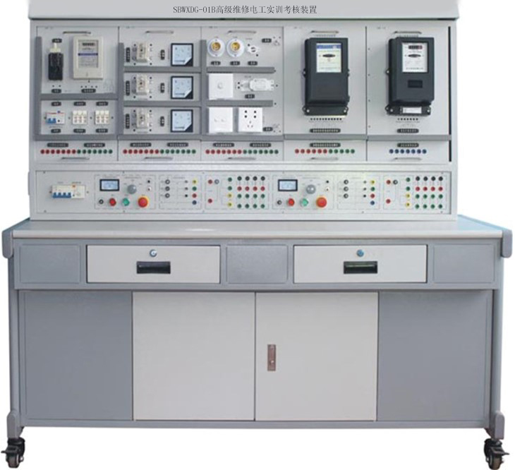 電氣安裝與維修實訓考核裝置是根據(jù)工廠電氣安裝和室內(nèi)電氣安裝等維修 電工和電氣安裝工實訓鑒定要求開發(fā)的一種通用實訓平臺。 適合于各類職業(yè)院校 和技工學校維修電工、 電氣安裝工、水電工等有電氣實訓要求的相關專業(yè)的作為 公共實訓平臺使用。 采用鋼制網(wǎng)孔板和鋼制專用型材組接而成,安裝有自鎖式腳輪,方便移動和使用。裝 置表面噴塑,色彩穩(wěn)重氣派。電氣安裝與維修實訓裝置設計高度以人站在一級人字梯即可方便操作的高度,既安 全又能使使用者感受到施工現(xiàn)場環(huán)境。 橫向、 叢向?qū)挾群线m, 可以模擬現(xiàn)場線路的轉向布置。