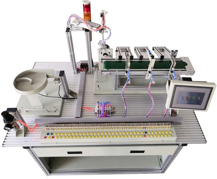 端子、變頻器的接線端子、各常用模塊與PLC的連接端子,均與安全插座連接,使用帶安全插頭的導線進行電路連接;各指令開關、光電開關、傳感器和指示元件的電路,則通過端子排進行連接。插拔線連接電路與端子牌連接電路相結合,既保證學生基本技能的訓練、形成和鞏固,又保證電路連接的快速、安全和可靠。